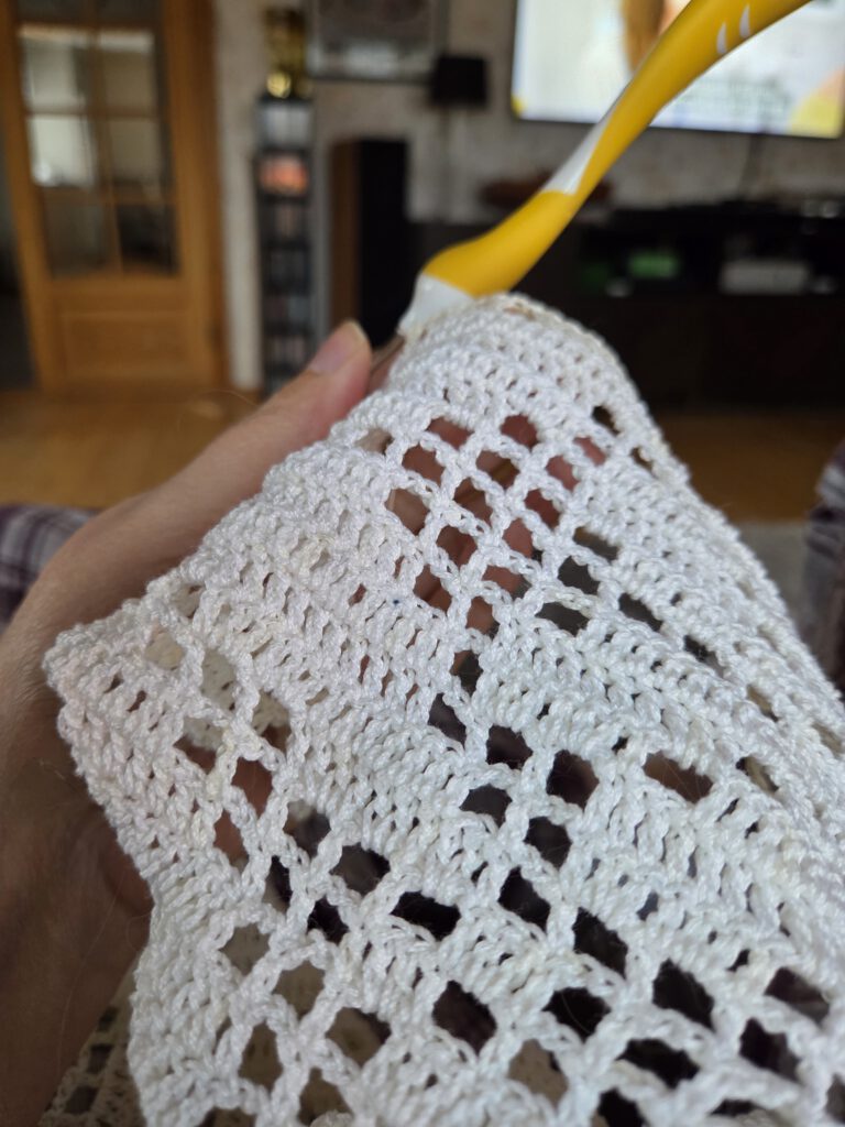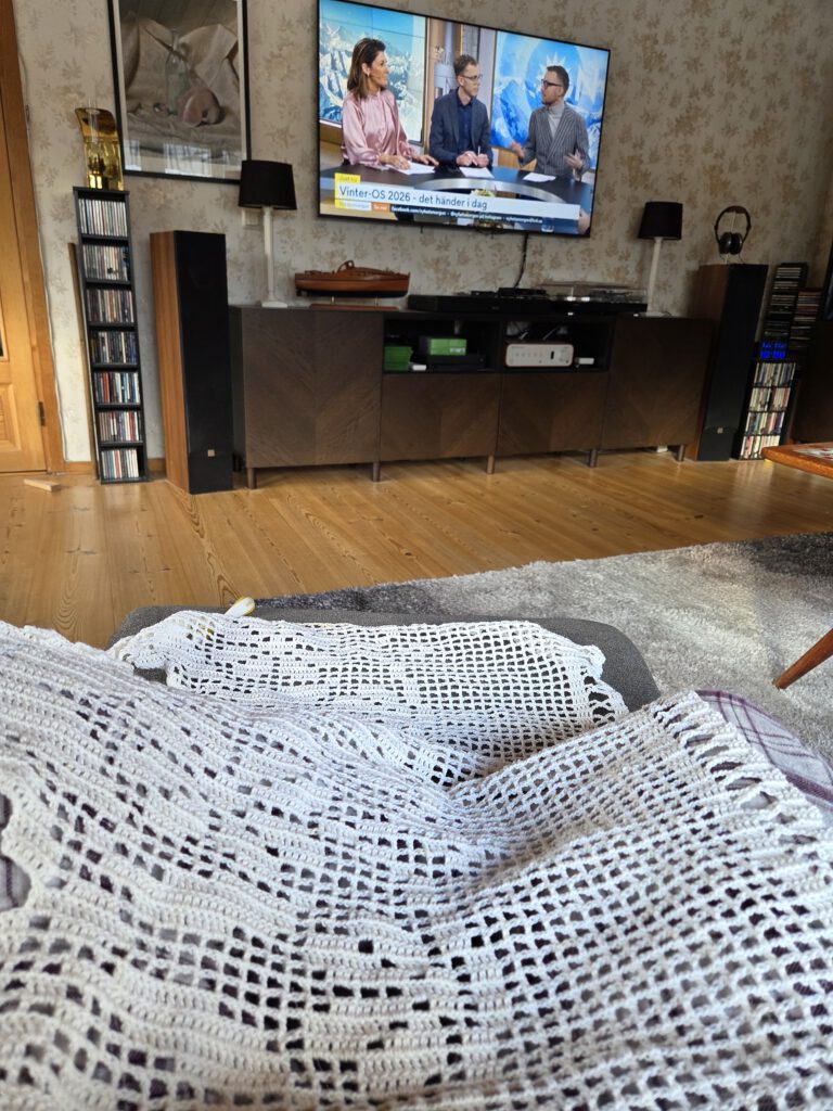 10.00 Har kommit upp, ätit frukost och sitter nu och virkar i fotöljen.