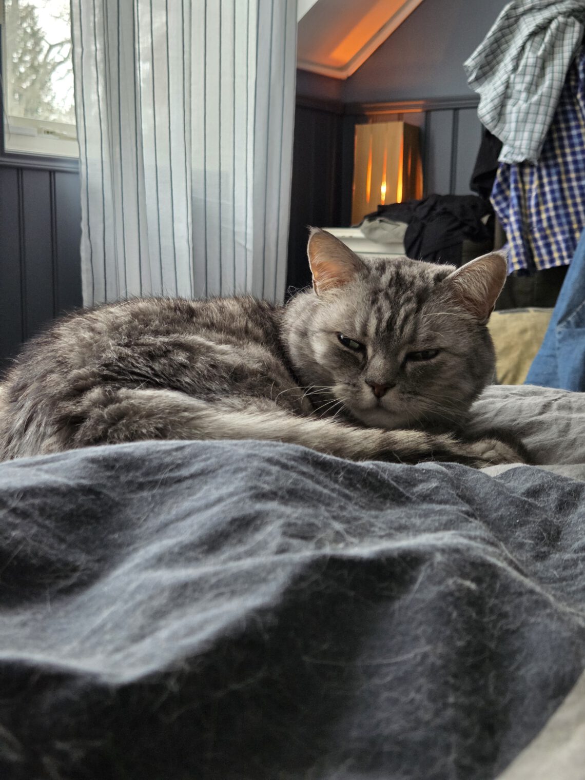 14.00 Vilar ryggen och har Tisse i närheten, han gillar inte kylan utan sover mest i sängen, vilket syns på bilden då påslakanet drar åt sigmassor av hår.